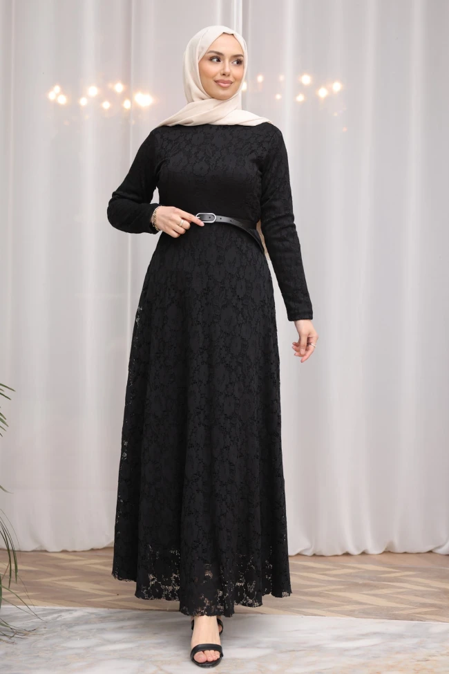 * Ürün Detay : Elbise, hem zarif hem de oldukça asil bir duruşa sahip.Elbisenin tamamının dantel kaplama olması, düz bir kumaşa göre çok daha zengin bir doku oluşturmuş. Dantelin deseni karmaşık ama göz yormuyor, bu da elbiseye romantik bir hava katıyor.Belden aşağıya doğru genişleyen kesim, hem konforlu bir hareket alanı sağlıyor hem de vücut hatlarını zarifçe gizleyerek dengeli bir silüet oluşturuyor.İnce kemer, elbiseyi hareketlendirmiş ve bel hattını belirginleştirerek "kum saati" görünümü yaratmış. Kemerin sadeliği, dantelin hareketliliğini güzelce dengelemiş.