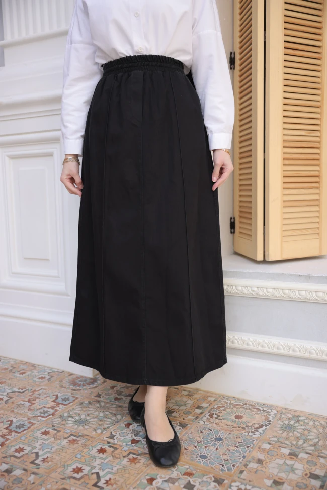 * Ürün Detay : Kot etek, klasiği modern ve konforlu detaylarla birleştiren çok kullanışlı bir parça. Hem tesettür giyim için ideal bir uzunluğa sahip hem de günlük giyimde çabasız şıklık vadediyor.Eteğin en belirgin özelliği belindeki lastik detayı. Bu detay, eteği hem çok konforlu hem de giymesi kolay hale getiriyor. Eteğin boyuna uzanan dikiş panelleri, eteğe hareketlilik ve modern bir yapı kazandırırken vücut hatlarını da daha uzun gösteriyor.