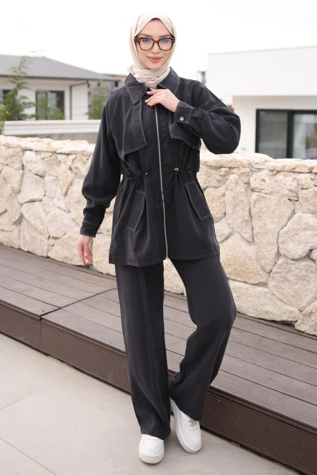 * Ürün Detay : Takım, hem modern hem de fonksiyonel detaylarıyla günlük kullanım ve ofis şıklığı için harika bir denge kuruyor.Ceketin en dikkat çekici özelliği, koyu zemin üzerindeki beyaz belirgin dikişler.Bel kısmındaki ayarlanabilir stoperli ipler, ceketin formunu kişiselleştirmene olanak tanıyor. Daha feminen bir silüet için beli vurgulayabilir veya daha rahat, maskülen bir görünüm için düz bırakabilirsin.Pantolon bel lastikli ceplidir.