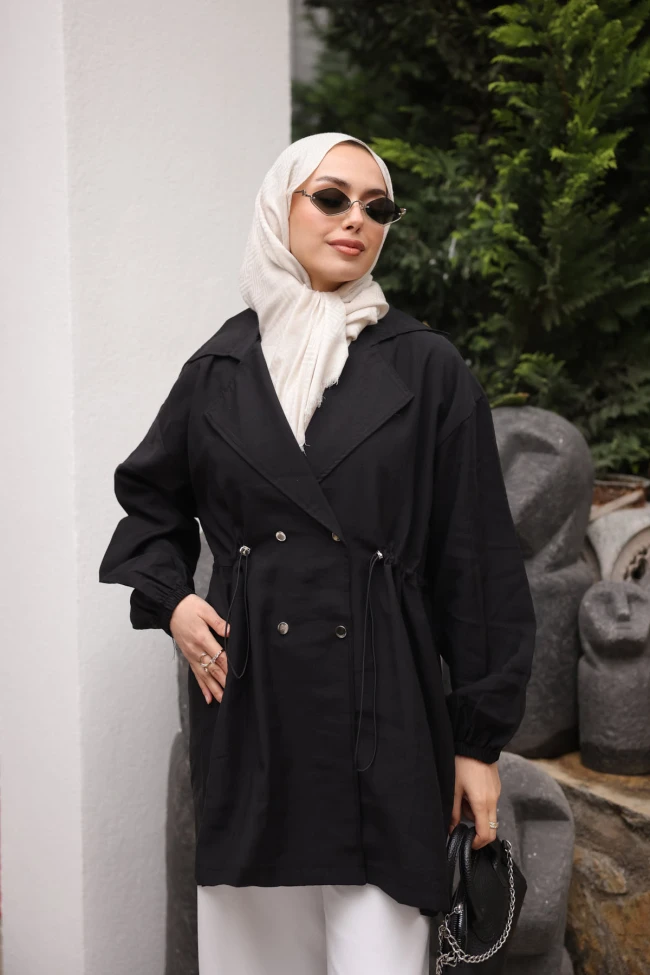 * Ürün Detay : Ceket, hem kumaş dokusu hem de fonksiyonel detaylarıyla günlük şıklığı konforla birleştiren bir parça.Bel kısmındaki ayarlanabilir büzgü detayı, ceketin en önemli özelliği. Bu sayede parça hem salaş bir "oversize" ceket olarak hem de beli vurgulayan daha feminen bir formda kullanılabiliyor.Geniş kruvaze yakalar modern bir silüet oluştururken, kullanılan düğmeler kumaş üzerinde şık bir kontrast oluşturmuş.Lastikli kol ağızları ve hafif balon kol formu, tasarıma hem hareket katıyor hem de günlük kullanımda pratiklik sağlıyor.