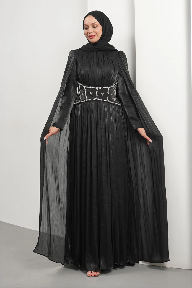 * Ürün Detay :  Abiyemiz, hem ihtişamı hem de geleneksel detayları modern bir formda sunan, oldukça iddialı bir tasarım. Bel bölgesindeki işlemeli ve geniş kemer formu abiyeye şık bir dokunuş sağlıyor. Omuzlardan aşağıya süzülen tül pelerin detayları, elbiseye görkemli bir hava katmış. Bu detay hem kolların formunu zarifçe kapatıyor hem de yürürken masalsı bir akışkanlık sağlıyor.Elbisenin üst bedeni tam otururken, eteğin piliseli ve dökümlü inişi boyu oldukça uzun ve silüeti ince gösteriyor.