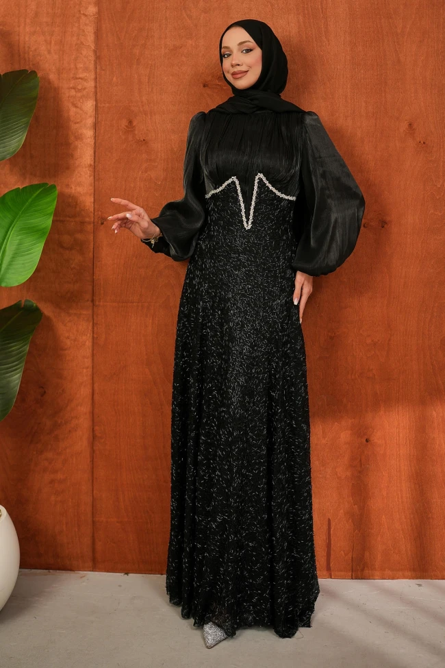* Ürün Detay :Işıltının en zarif haliyle tanışın! Bel hattındaki kristal detayları ve uçuş uçuş balon kollarıyla bu özel tasarım abiye, en mutlu günlerinizde size eşlik etmek için hazır. Zarafeti detaylarda saklı olanların tercihi…Üst kısımdaki hafif ışıltılı büzgülü doku ile etek kısmındaki yoğun işleme harika bir kontrast oluşturmuş.Bel hattındaki taş detaylı "V" geçişi, vücut formunu daha uzun ve ince gösteren stratejik bir dokunuş.Balon kol detayı, elbiseye hem romantik hem de modern bir hava katarken, tesettür giyimde aranan o zarif hacmi sağlıyor.