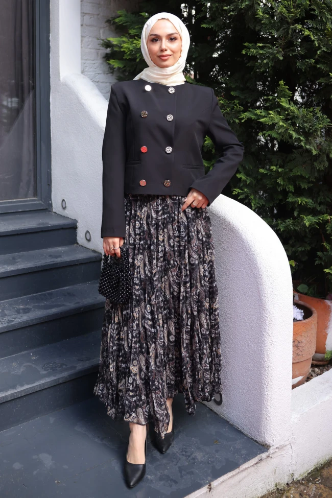 * Ürün Detay : Kruvaze kesimli siyah ceket, üzerindeki gold detaylı büyük düğmelerle zengin bir görünüme sahip. Hakim yaka ve kısa kesimi, alt parçanın hareketliliğini dengeleyerek modern bir silüet oluşturuyor.Şal desenli pileli etek, kombine hem klasik hem de dinamik bir hava katmış. Eteğin dökümlü yapısı, tesettür standartlarına uygun bir konfor sunuyor.