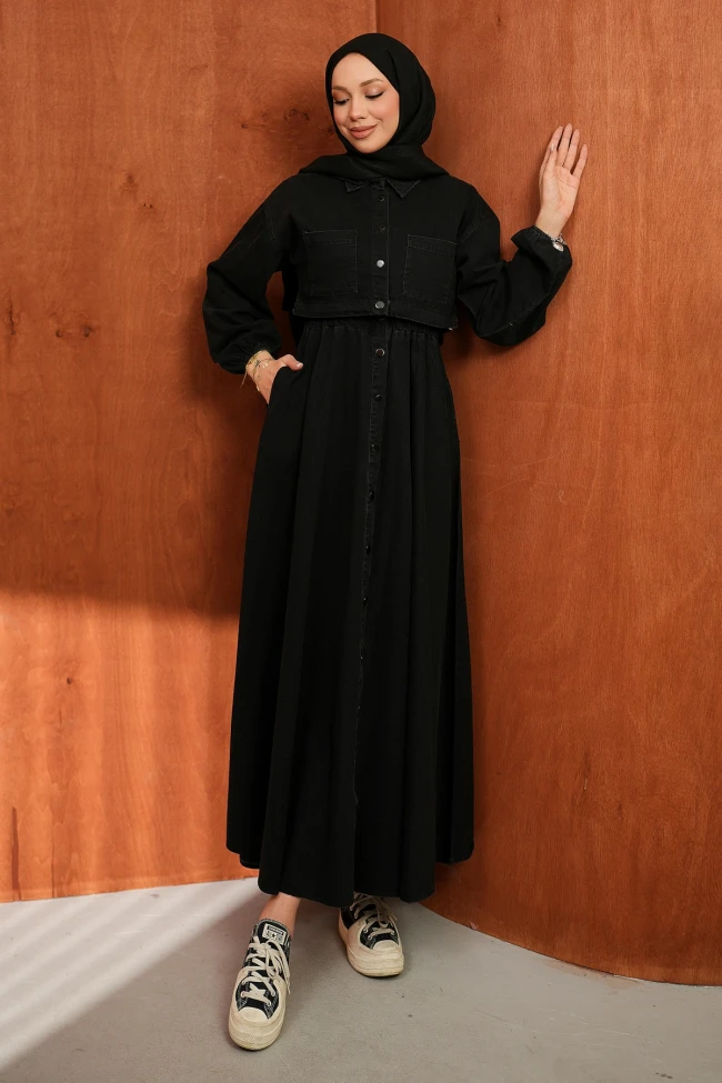 * Ürün Detay :Ceket ve elbise takımı, modest moda için oldukça güçlü ve dengeli bir görünüm sunuyor.Kısa ceket kesimi, bel hattını yukarı taşıyarak boyu daha uzun gösteren bir illüzyon oluşturuyor. Göğüs üzerindeki cep detayı, cekete klasik "jean ceket" karakterini verirken, elastik kol manşetleri modern bir dokunuş eklemiş.Beldeki büzgü detayı vücut hatlarını belli etmeden zarif bir silüet oluşturuyor. Boydan düğmeli olması ise hem kullanım kolaylığı sağlıyor hem de dikey bir hat oluşturarak ince bir görünüm destekliyor.Elbise bel lastiklidir.Kolsuzdur.