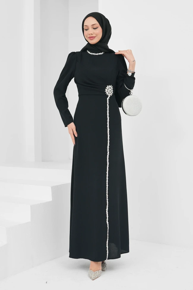 * Ürün Detay : Abiyemiz, net çizgileri ve stratejik taş detaylarıyla koleksiyonunun en asil parçalarından biri olarak öne çıkıyor.Elbisenin düz, A kesime yakın formu, farklı vücut tiplerine uyum sağlayacak joker bir kalıptır.Bel kısmındaki dökümlü geçişi sabitleyen çiçek formlu taşlı broş, tasarıma hareket katıyor. Bu noktadan aşağıya doğru dikey olarak inen inci ve taş hattı, boyu daha uzun ve silüeti daha ince gösteren çok şık bir detay.Hakim yakadaki ince taş işlemesi, kolye kullanımına gerek bırakmadan yüz hattını aydınlatıyor. Hafif kabarık omuz yapısı ise duruşa daha vakur bir hava katmıştır.