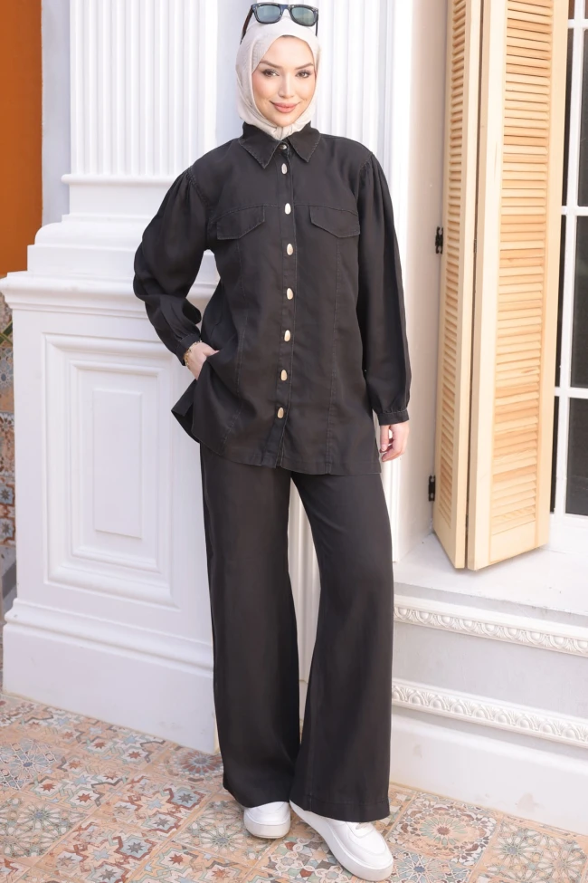 * Ürün Detay : Takım, hem modern hem de muhafazakar moda anlayışını başarıyla birleştiren, oldukça işlevsel bir parça. Omuzlardaki hafif büzgü detayları ve balon kol yapısı, maskülen denim havasını yumuşatarak daha feminen ve zarif bir görünüm kazandırmış.Bol paça kesimi, sezonun en güçlü trendlerinden biri. Hem rahatlık sağlıyor hem de denim bütünlüğünü bozmuyor.Pantolon yüksek bel bel lastikli ve cepli.