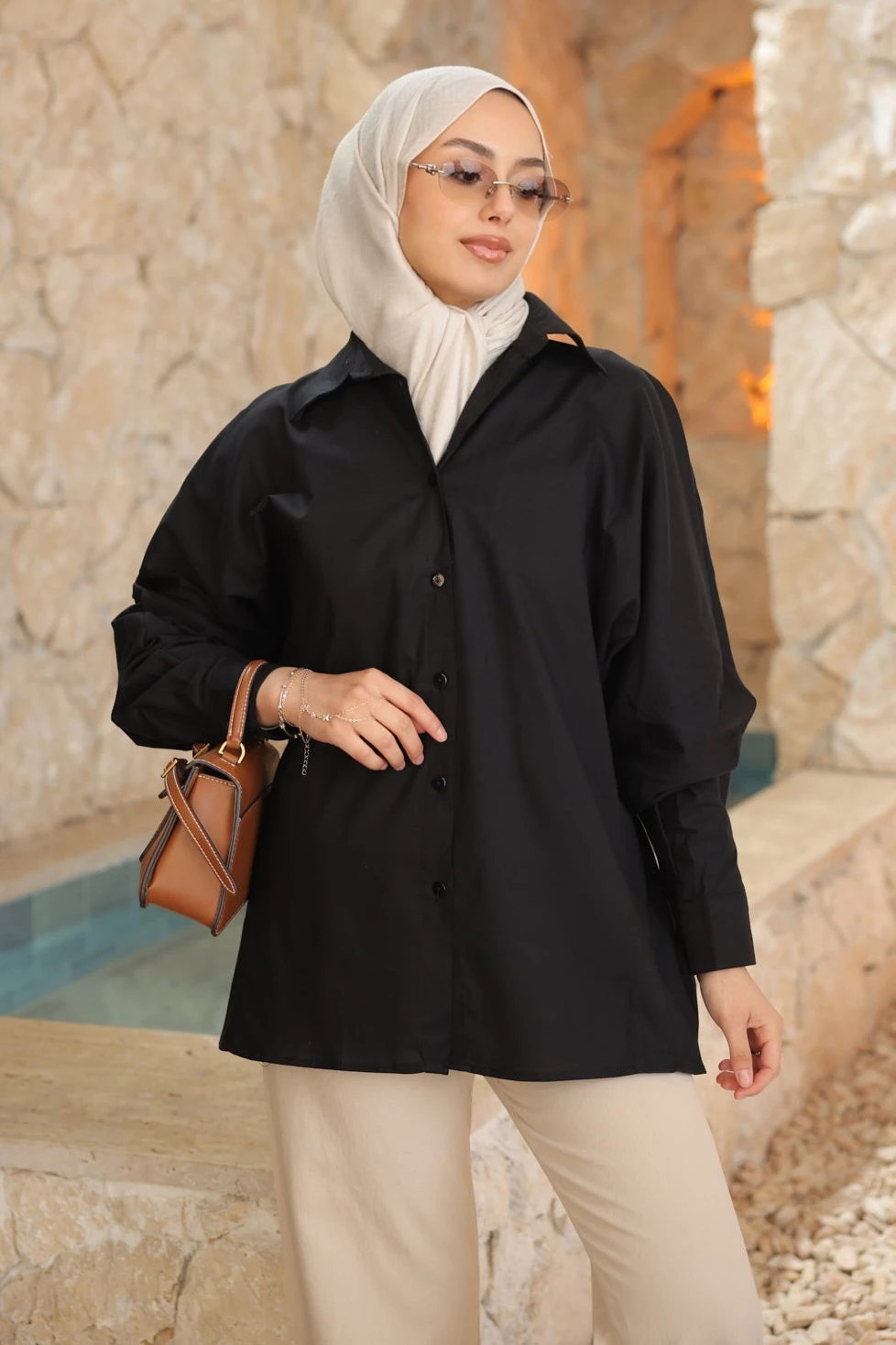 * Ürün Detay : Gömlek, özellikle tesettür giyimde aranan "oversize ama formlu" duruşu çok iyi yakalamış bir parça. Hem günlük kullanım hem de ofis şıklığı için oldukça potansiyelli.Ürünün en can alıcı noktası sırtındaki pens detayları. Bu detay, gömleğin arkadan dümdüz durmasını engelleyerek ürüne daha tasarım bir hava katmış ve bel hattını hafifçe belli ederek zarif bir silüet oluşturmuş.Manşetlerin genişliği ve klasik yaka kesimi, gömleğin formunu dik tutuyor.