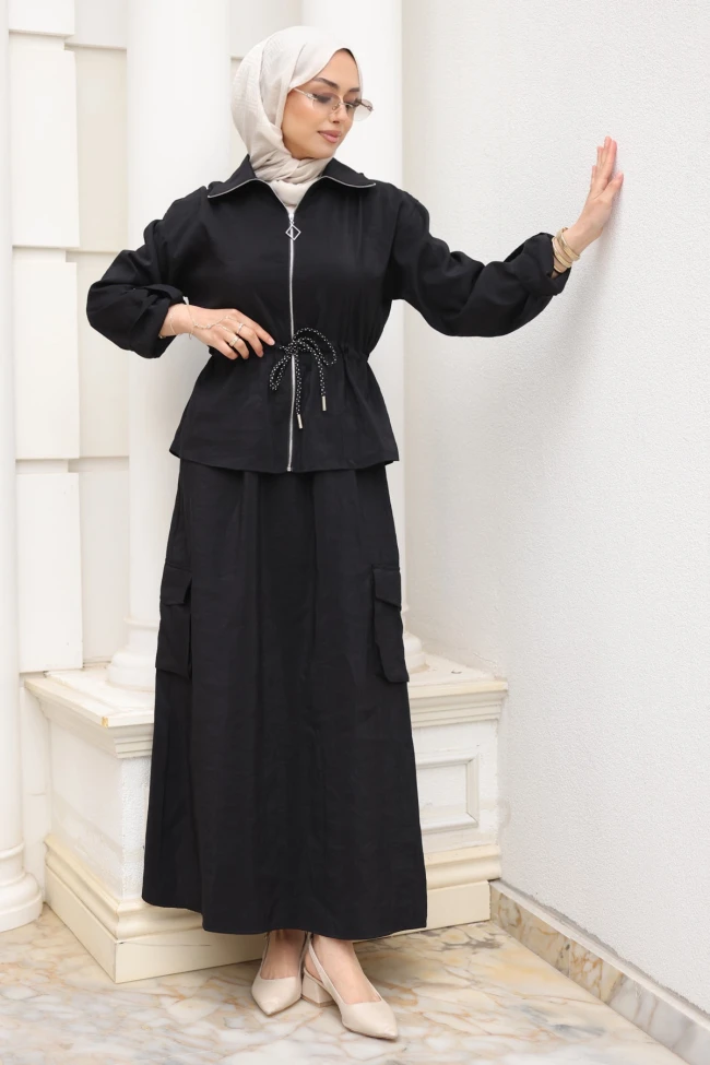 Vizon Fermuarlı Ceket Kargo Cepli Etekli Takım Lacivert Fermuarlı Ceket Kargo Cepli Etekli Takım Kahverengi Fermuarlı Ceket Kargo Cepli Etekli Takım