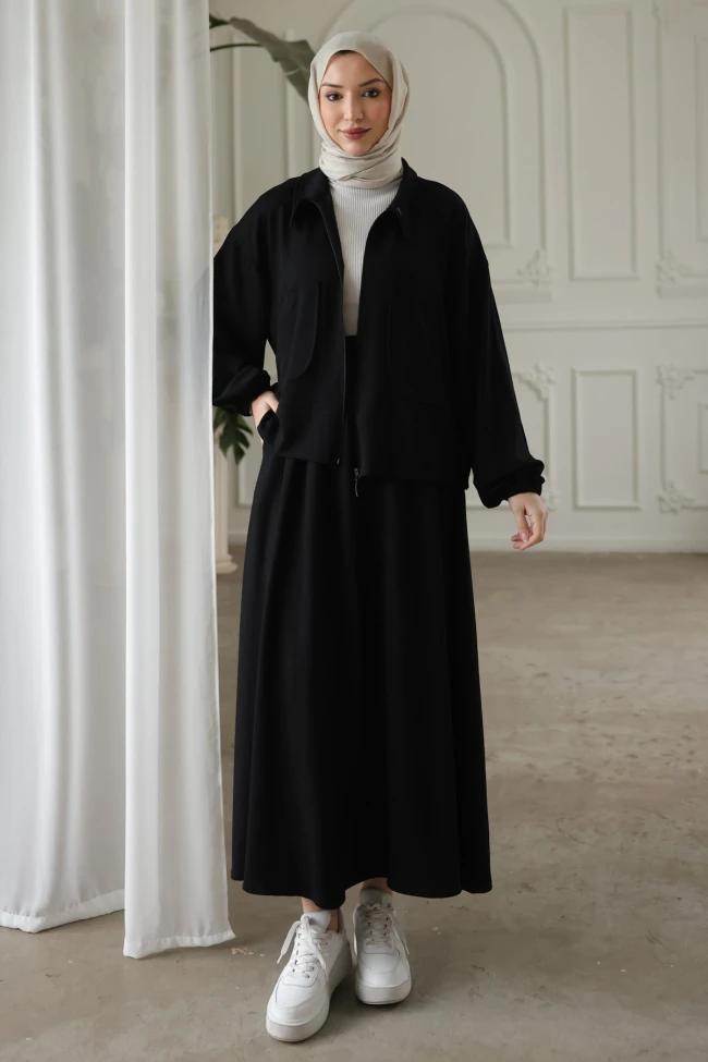 * Ürün Detay :Takım, "giy ve çık" rahatlığını sevenler için ideal. Özellikle yumuşak dokulu modal kumaşı, gün boyu hareket özgürlüğü sunarken; ceketindeki oversize kesim ve büyük cep detayları takıma modern bir hava katmış.Yanlardaki çıtçıt detayları ise sıradan bir eşofman takımı görüntüsünden uzaklaşıp, ürüne tasarım bir dokunuş katmış.Rahat ve modern oversize kesim.Pratik kullanım sağlayan boydan fermuarlı ön kapama.Bilekleri kavrayan elastik manşetler.Belden oturan, aşağıya doğru hafif genişleyen zarif maxi boy etek.Takım, modern ve modest tarzı hoş bir şıklıkla birleştiren, oldukça konforlu görünen bir ikili takım.