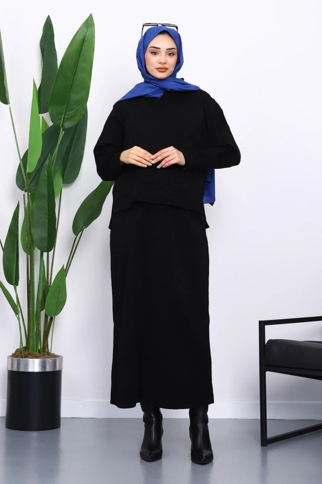 * Ürün Detay : Ürünümüz Simli Triko kumaştan üretilmiştir.  Bluz ile Etek ikili takım şeklindedir. Etek bel kısmı lastiklidir.