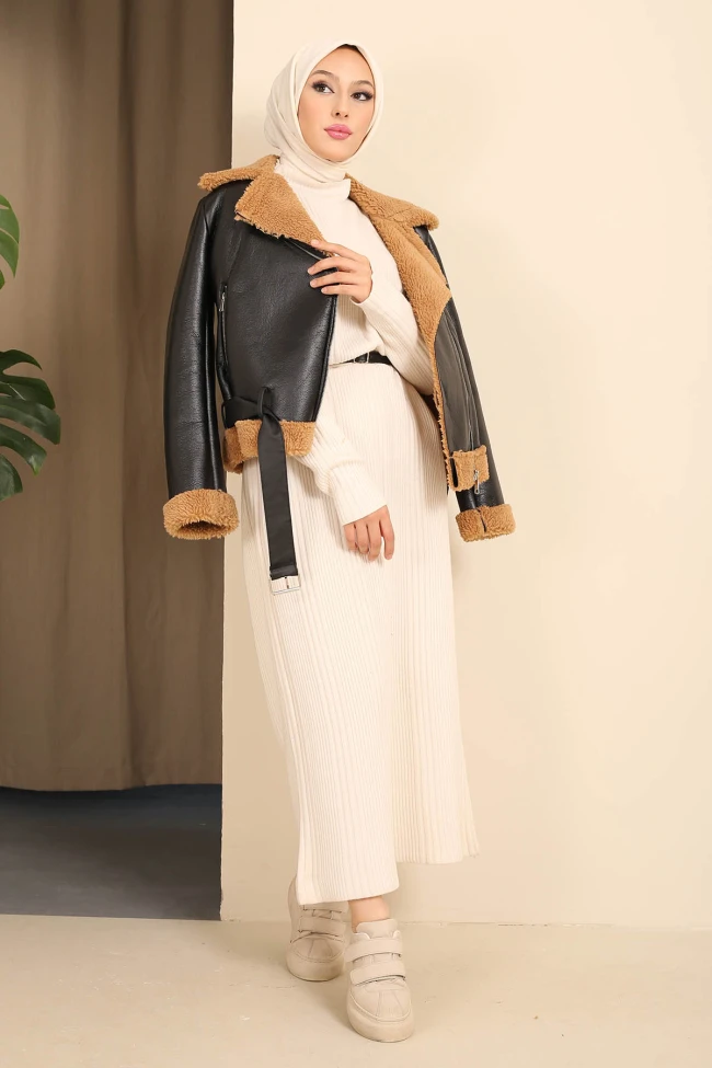 * Ürün Detay : Ürünümüz suni deri kumaştır. İçi peluştur. Boydan fermuarlıdır. Kemer detayı mevcuttur. Kol uçlarında peluş detayları vardır.