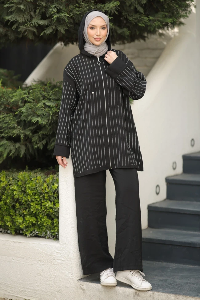 * Ürün Detay : Takım, spor-şık akımını tesettür modasına çok modern ve dinamik bir şekilde taşıyor. Klasik spor takımların konforunu, dikey çizgi detaylarıyla görsel bir şölene dönüştürmüş.Zemin üzerine kullanılan beyaz dikey çizgi şeklindeki taşlar, takıma sadece hareket katmakla kalmıyor, aynı zamanda optik olarak vücut formunu daha uzun ve ince gösteriyor.Üst parça, fermuarlı ve kapüşonlu yapısıyla sportif bir ruh taşıyor. Düşük omuz kesimi ve geniş manşetleri, modern sokak stiline vurgu yaparken, ideal boyu tesettür standartlarını tam karşılıyor. Fermuar ucundaki geometrik detay ise ince bir tasarım dokunuşu olmuş.Düz ve bol paça pantolon, hareketli üst parçayı çok iyi dengeliyor.