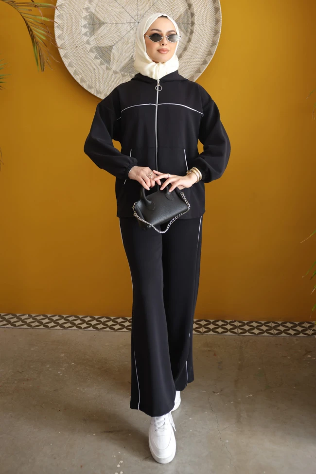 * Ürün Detay : Bu takım, "çabasız şıklık" tanımının tam karşılığı.Hem konforu hem de modern stili bir araya getiren oldukça dengeli bir parça.Zemin üzerine eklenen ince beyaz şeritler, takıma sportif bir hava katarken aynı zamanda vücut hattını dikeyde bölerek daha ince ve uzun bir silüet illüzyonu yaratıyor.Sweat hafif "oversize" ve düşük omuzlu kesimi, gün boyu hareket özgürlüğü vaat ediyor. Pantolonun bol paça gelişi ise hem tesettür giyim standartlarına uygun hem de oldukça trend bir görünüm sunuyor.Fermuar detayı ve cepler, takımı sadece şık değil, aynı zamanda pratik bir "günlük kurtarıcı" haline getirmiş.
