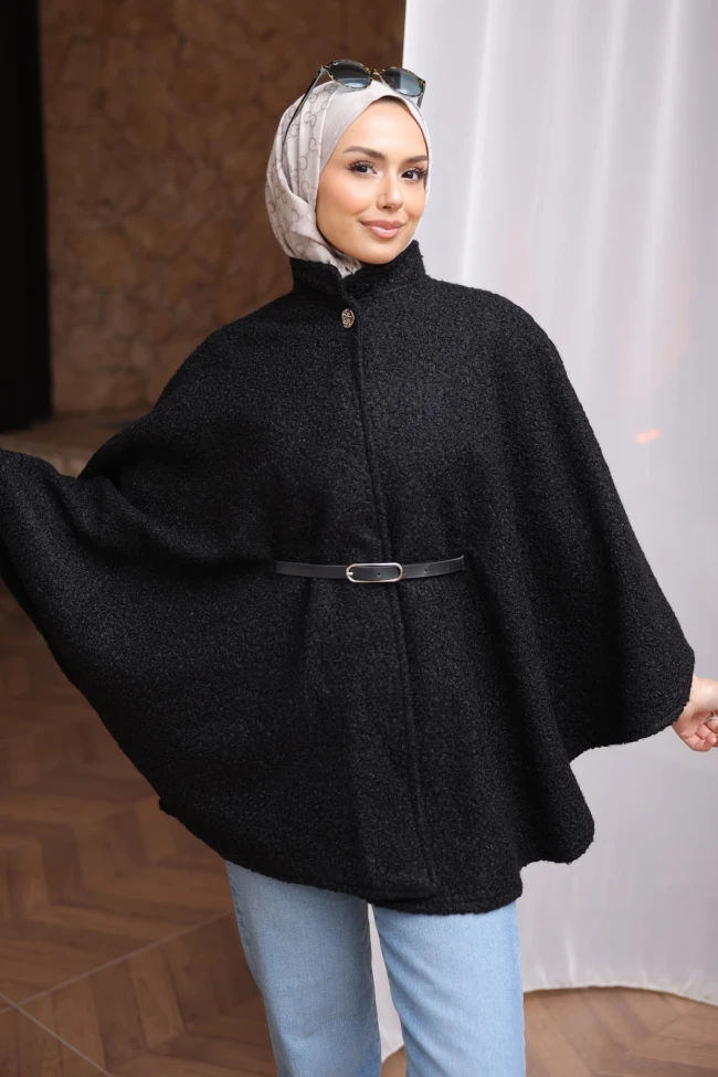 * Ürün Detay : Panço, hem dokusu hem de rengiyle modern ve enerjik bir duruş sergiliyor.Buklet dokusu, parçaya zengin ve kaliteli bir hacim kazandırmış. Bu tür kumaşlar hem sıcak tutar hem de formunu kolay kaybetmez.Geniş pelerin kesimi, hareket özgürlüğü sağlarken modern bir silüet oluşturuyor. Dik yaka ve tek düğme detayı ise minimal ama etkili bir dokunuş olmuş.İnce bir kemer kullanımı beli vurgulayarak vücut hatlarını dengeli bir görünüme kavuşturmuş.