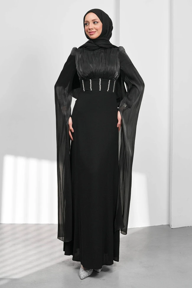 * Ürün Detay : Abiye, hem asil hem de dramatik detaylarıyla tam bir "özel gün" tasarımı.Elbisenin en çarpıcı yeri kesinlikle pelerin etkili uzun kolları. Omuzdan yere kadar uzanan piliseli janjan kumaş, yürürken veya hareket ederken elbiseye muazzam bir akışkanlık kazandıracaktır. Bu tarz kollar, kişiye olduğundan daha uzun ve görkemli bir hava katar.Bel kısmındaki geniş kemer , arkadaki bağcık detayıyla birleşince bel hattını çok güzel vurguluyor. Arkadan bakıldığında korsaj havası vererek beli daha ince gösteriyor.Göğüs kısmındaki büzgüler elbiseye hacim katarken, eteğin düz inişi bu hacmi dengeliyor ve karmaşayı önlüyor.