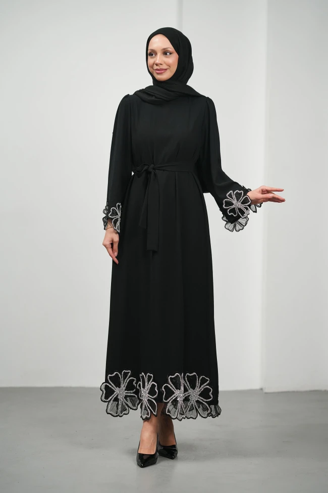 * Ürün Detay :Hem kullanılan aplikeleri hem de zarif kesimiyle abiyemiz koleksiyonunun en dikkat çekici parçalarından biri olmaya aday.Abiyenin en belirgin özelliği, manşetlerde ve etek ucunda kullanılan organze üzerine taş işlemeli çiçek motifleri. Bu detaylar, elbiseye hem üç boyutlu bir hareket kazandırıyor hem de romantik bir hava katıyor.Bel kısmındaki kendi kumaşından yapılan ince kuşak, bel hattını vurgulayarak daha muntazam bir silüet oluşturmanı sağlıyor.Hafif vatkalı ve dökümlü kol kesimi, manşetlerdeki yoğun işçiliği ön plana çıkarırken modern bir tesettür stili sergiliyor.Tok ve pürüzsüz kumaş dokusu, abiyenin canlılığını net bir şekilde yansıtıyor. Düz inen etek formu, boyu olduğundan daha uzun gösteren asil bir duruş sunuyor.