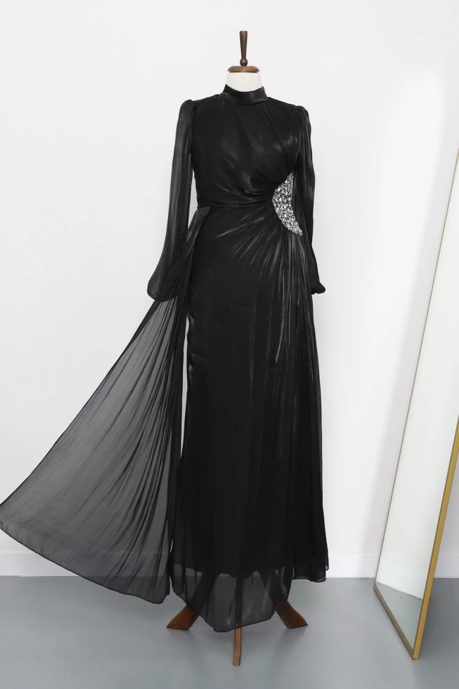 Taş Kolu Lastikli Taş Detaylı Abiye Lacivert Kolu Lastikli Taş Detaylı Abiye