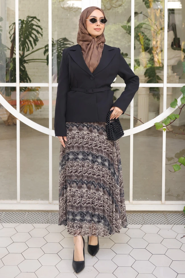 * Ürün Detay : Her anınıza eşlik edecek bu özel tasarım takım, modest modanın en zarif parçalarını bir araya getiriyor. Tasarımında konfor ve estetiği odağına alan bu kombin, gardırobunuzun en joker parçası olmaya aday.Modest moda standartlarına uygun uzunluk ve kesim detayları ile güvenli bir şıklık sunar.Siyah, bele oturan ve ince bir kemerle detaylandırılmış bu ceket, vücut hatlarını zarifçe dengeleyerek profesyonel bir duruş sergiliyor.Desenli alt ve düz renkli üst parçanın birleşimi, görsel olarak dengeli bir kontrast oluşturuyor.