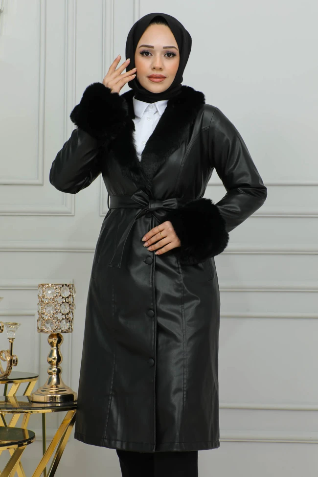 * Ürün Detay : Ürünümüz yeni sezona uygun üsuni deri kumaştan üretilmiştir. Beli kuşaklıdır. Yaka ve kolları kürklüdür. Cepleri mevcuttur.