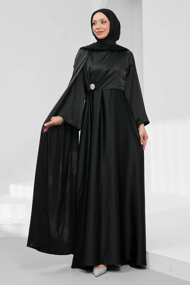 * Ürün Detay : Abiye, zarafeti ve asil duruşu ön plana çıkaran, oldukça şık bir tasarım.Belden aşağıya doğru süzülen etek kesimi, boyu olduğundan daha uzun ve silüeti daha ince gösteren bir yapıda.Bel hattındaki taşlı broş, elbiseye odak noktası kazandırmış. Sade tasarımı bir anda "gece kıyafeti" seviyesine taşımış.Bir tarafta pelerin etkisini andıran geniş kesim, modele asimetrik ve modern bir hava katmış. Modest stil ile yüksek modayı birleştiren bir detay.