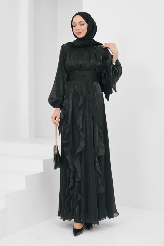 * Ürün Detay : Abiyemiz hem kullanılan kumaş dokusu hem de romantik detaylarıyla koleksiyonun en zarif parçalarından biri olmaya aday.Ürünümüz şifon kumaştan üretilmiştir.Sırt fermuarlıdır.Etek kısmından aşağıya doğru inen dikey fırfır detayları, tasarıma hem hareket hem de romantik bir hava katmış. Bu detaylar aynı zamanda silüeti daha akışkan gösteriyor.Beldeki geniş kumaş kuşağı, piliseli dokuyu toplayarak vücut hattını belirginleştiriyor ve üst beden ile etek arasında şık bir geçiş sağlıyor.Manşetlerdeki bağlama detaylı balon kollar, son dönem tesettür modasının en hit ayrıntılarından biri. Bu kollar, elbiseye hem modern hem de nostaljik bir dokunuş ekliyor.