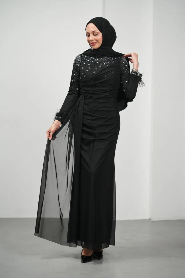 * Ürün Detay : Manşetlerde kullanılan tüy detayları, bu sezonun en popüler trendlerinden biri. Bu detay, elbiseye hareket ve lüks bir dokunuş ekliyor.Abiye modelimiz, klasik zarafeti modern ve iddialı detaylarla harmanlayan, tam bir "gece şıklığı" parçasıdır. Omuz ve göğüs bölgesinde yoğunlaşan gümüş taş işlemeleri, abiyemizin asaletini ön plana çıkarırken yüze aydınlık bir ifade katıyor. Bel bölgesindeki asimetrik drapeler, vücut hatlarını zarifçe şekillendiriyor. Yan taraftan süzülen şifon pelerin detayı, yürüyüş esnasında dramatik ve akışkan bir görüntü oluşturacaktır.