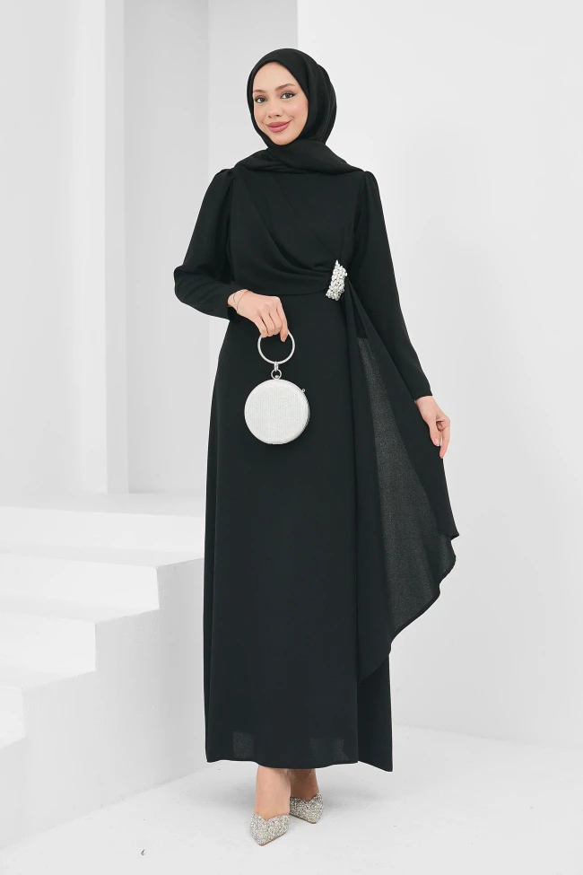 * Ürün Detay : Yeni sezon abiyemiz, "zamansız şıklık" tanımına uyan, son derece zarif ve ağırbaşlı bir tasarıma sahip.Göğüs kısmından bele doğru inen asimetrik drapaj, elbiseye derinlik ve hareket katıyor. Belde toplanan bu katmanlar, silüeti daha ince ve uzun gösteren bir illüzyon yaratıyor.Beldeki broş detayı abiyenin sadeliğini kırarak odak noktası oluşturuyor.