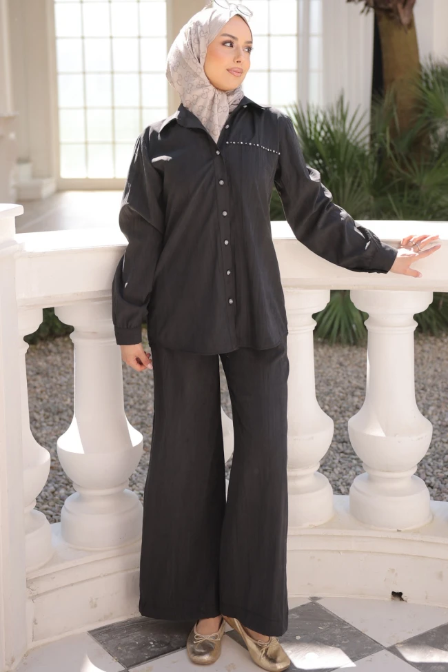 * Ürün Detay : Takım, hem modern hem de klasik çizgileri birleştiren, oldukça zarif bir şıklık sunuyor.Geniş paça pantolon ve dökümlü gömlek ikilisi, güncel "oversize" trendine uygun, konforlu bir silüet çiziyor.Tuniğin cebindeki ince taş işlemesi, düz ve sade tasarımı hareketlendirerek takıma hoş bir hava katmış.Pantolon bel lastikli ve ceplidir.