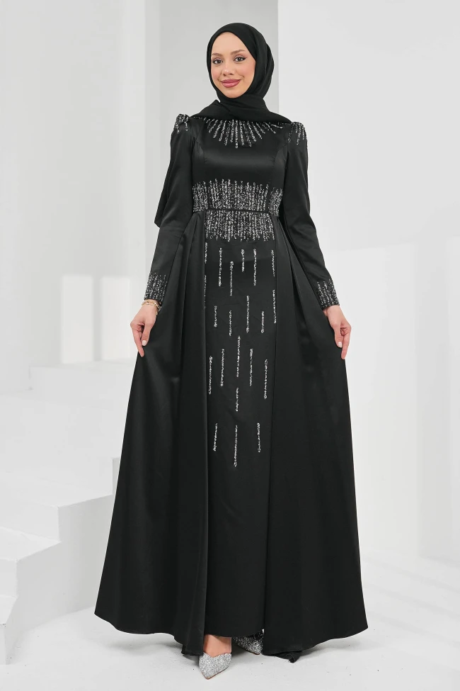 * Ürün Detay :Yeni sezon abiyemiz, modern ve geleneksel hatları birleştiren, oldukça zarif bir tesettür abiye modeli.Elbisenin en dikkat çekici kısmı, göğüs altındaki geniş panel işleme. Bu gümüş rengi işlemeler, omuzlardaki apolet benzeri detaylar ve manşetlerle desteklenerek bütünlük sağlanmış. Etek kısmına doğru ince dikey hatlar şeklinde inen ışıltılar, boyu olduğundan uzun gösterme etkisine sahip.A kesim etek formu, beldeki oturtmalı kesimle birleşince feminen ama ölçülü bir silüet oluşturmuş. Etekteki drapeler modele hareket katarken, saten kumaşın ağırlığını başarıyla taşıyor.