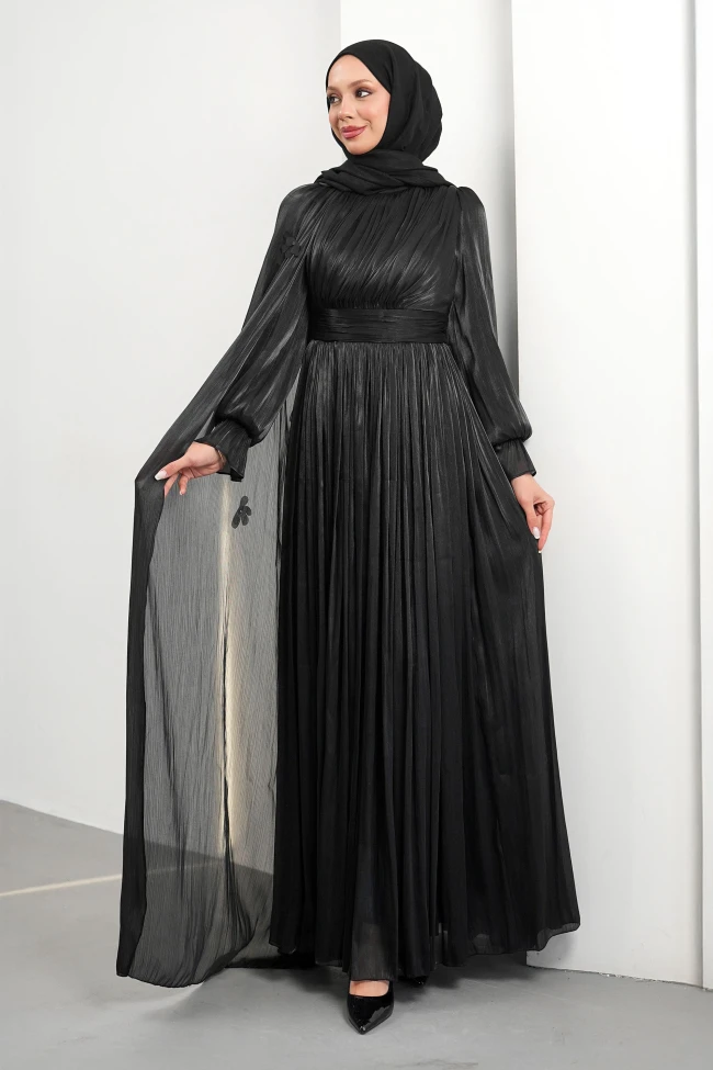 * Ürün Detay :Abiye modelimiz modest bir çizgide oldukça zarif bir görünüm sunuyor.Elbisenin tamamında kullanılan dikey plise detayları, boyu olduğundan daha uzun göstermek için harika bir illüzyon sağlıyor. Beldeki kalın kuşak detayı, vücut hatlarını zarifçe belirginleştirerek proporsiyonu dengeliyor.Omuzdan aşağıya doğru süzülen şifon pelerin detayı, elbiseye hareket ederken uçuş uçuş bir görünüm sağlayarak asalet katıyor.