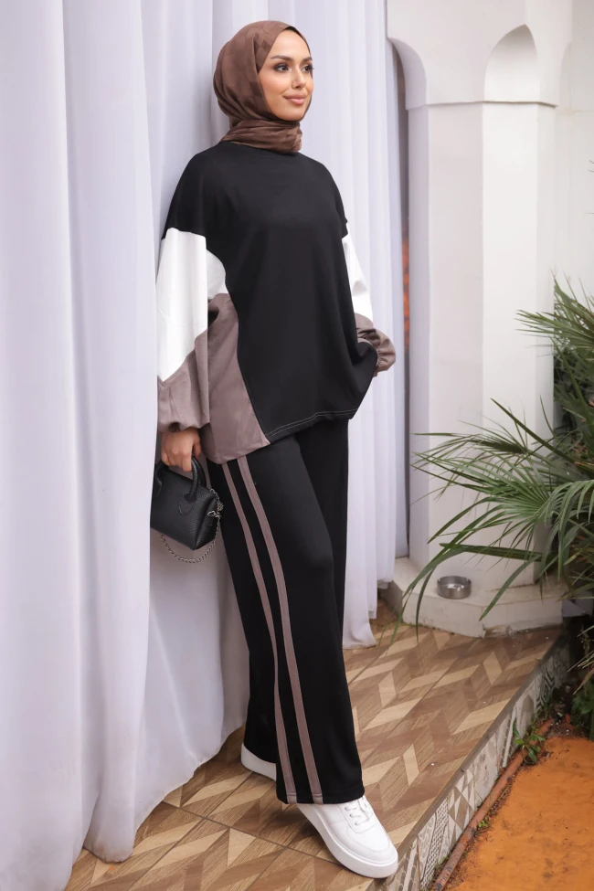 * Ürün Detay : Takım, renk blokları ve dinamik detaylarıyla "sportif şıklığı" bir üst seviyeye taşıyor.Özellikle kollardaki asimetrik geçişler görsel bir derinlik katıyor.Balon kol formunun uç kısımlarında daralması, konforlu bir kullanım sağlarken şık bir siluet oluşturuyor.Pantolonun yanlarındaki dikey şeritler, bacak boyunu daha uzun göstermek için harika bir illüzyon sağlıyor.Pantolon bel lastikli ve ceplidir.