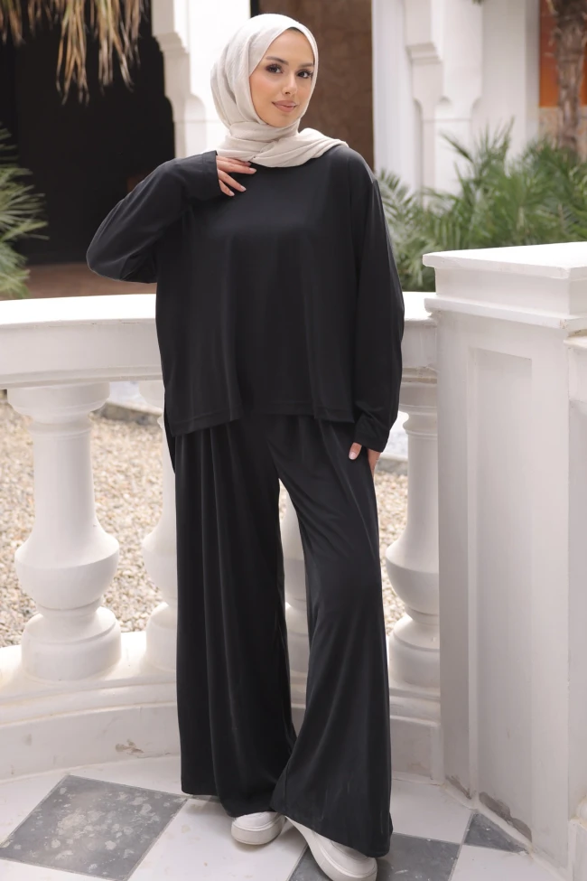 * Ürün Detay : Takım, özellikle çaba sarf etmeden şık görünmek isteyenler için "kurtarıcı" bir parça. Takım, konforu ve şıklığı bir araya getiren modest giyim örneği.Sadelik, takımı hem günlük kullanım için hem de aksesuarlarla zenginleştirilerek daha şık ortamlar için uygun hale getiriyor.Pantolon yüksek bel.Bel lastikli.