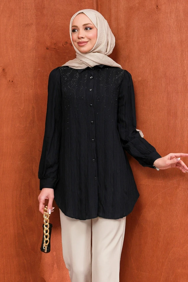 * Ürün Detay : Günün her anında ışıldamanızı sağlayacak, modern ve zarif bir dokunuş. Özel dokulu kumaşı ve titizlikle işlenmiş taş detaylarıyla bu gömlek, hem ofis şıklığında hem de akşam programlarınızda stilinizin anahtar parçası olacak.Göğüs kısmında yer alan zarif taş işlemeleri, gömleğe sofistike bir hava katarak klasik bir görünümü lüks bir tarza dönüştürür.Fonksiyonel düğme yapısı ve muntazam yaka kesimiyle hem önü kapalı hem de içine bir body ile önü açık şekilde kombinlenebilir.