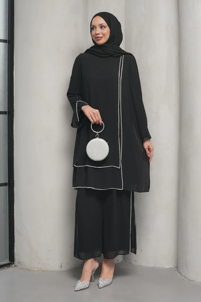 * Ürün Detay :Abiye takımı, modern ve minimalizmi ışıltılı detaylarla birleştiren oldukça dengeli bir tasarım.Şifon kumaşın hafifliği ve katmanlı tunik kesimi, tasarıma hem asil bir hava hem de hareket kabiliyeti kazandırmış.Tunik ve pantolon kenarlarında kullanılan ince taş detayları, renk düzlüğünü modern bir çizgiyle kırmış. Bu detaylar takımı klasik bir abiyeden modern bir davet kıyafetine dönüştürüyor.Bol paça kesim, dökümlü kumaşla birleşince hem konforlu hem de boyu uzun gösteren bir silüet oluşturmuş.Pantolon bel lastiklidir.