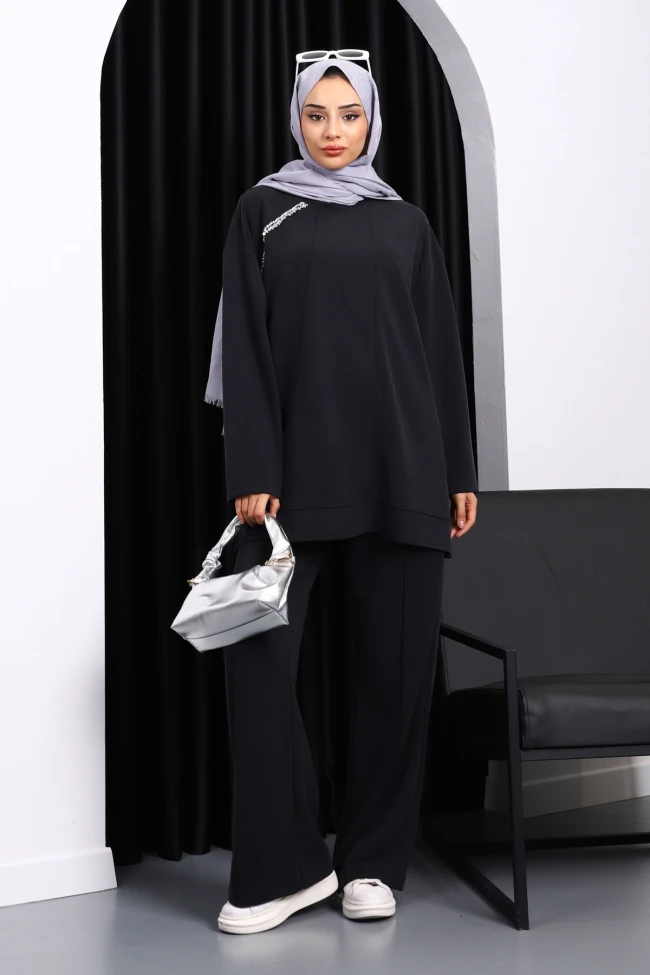 * Ürün Detay : Ürünümüz Modal kumaştan üretilmiştir. Tunik ile Pantolon ikili takım şeklindedir.  Tunik omuz kısmında taş işleme detayı yer almaktadır. Pantolon bel kısmı lastiklidir.