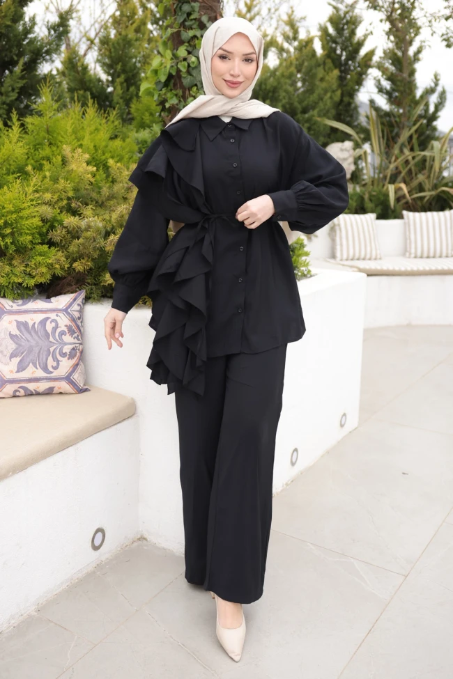 * Ürün Detay : Takımı, asimetrik fırfır detayları ve dökümlü yapısıyla hem çok modern hem de iddialı bir duruş sergiliyor.Avangart detayları günlük konforla buluşturan, sıradanlıktan uzaklaşmak isteyen kadınlar için tasarlanmış özel bir parça.Ön kısımdan başlayıp aşağı doğru uzanan yoğun fırfır detayı, tasarıma dinamik bir hareket kazandırmış.Pantolon bel lastiklidir.Ceplidir.