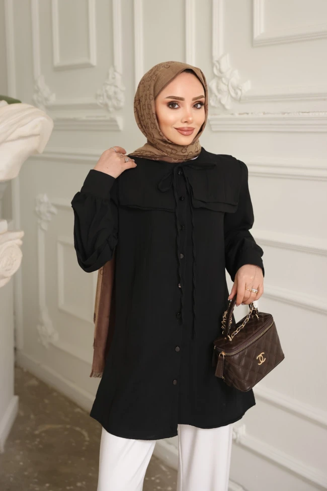 * Ürün Detay : Zarif detayların modern kesimlerle buluştuğu bu tunik gömlek, gardırobunuzun en joker parçalarından biri olmaya aday.Gömlek, özellikle modest tarzını benimseyenler için hem şık hem de karakterli bir parça.Geniş, kare formlu bebe yaka detayı, omuz hattına hareket katarak romantik ve vintage bir hava katıyor.Dirsek hizasındaki yatay piliseler ve büzgülü manşetler, kolların formuna derinlik katar.Gömlek, "çaba sarf etmeden şık görünmek" isteyenler için ideal bir tercih.