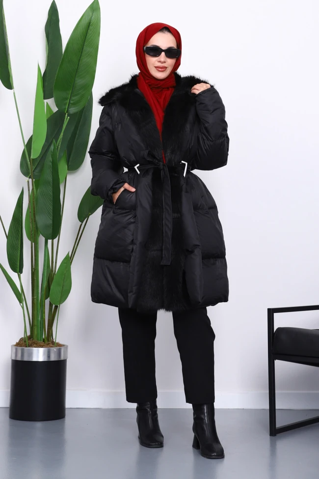 * Ürün Detay : Ürünümüz Dolgu kumaştan üretilmiştir. Yaka ve kenarları kürk detaylıdır. Bel kısmı kuşaklı ve ceplidir.