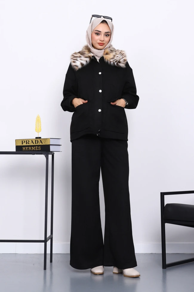 * Ürün Detay : Ürünümüz Süet kumaştan üretilmiştir. Ceket ile Pantolon ikili takım şeklindedir. Ceket Ön kısmı fermuarlı ve düğmelidir. Göğüs kısımları cep detaylıdır. Yaka kısmı kürk detaylıdır.