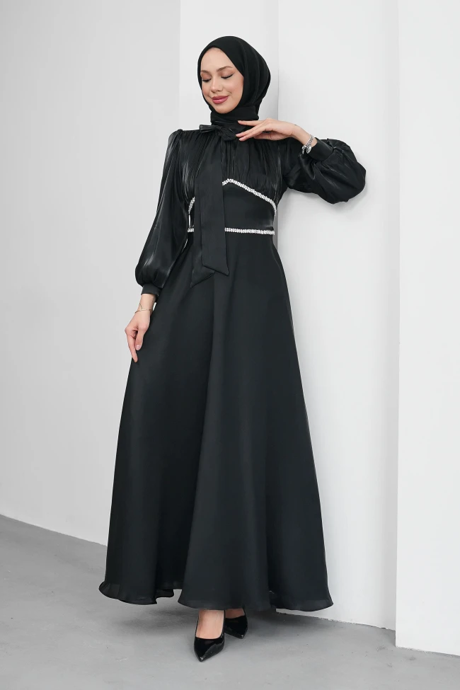 * Ürün Detay : Romantik ve masalsı bir tasarıma sahip olan abiye modelimiz yeni sezonda sizlerle.Göğüs altındaki taşlı şeritler ve boyundaki fiyonk detayı, tasarıma feminen ve zarif bir hava katmış. Göğüs kısmındaki büzgüler ise üst bölüme hacim kazandırıyor.Balon kol tasarımı, elbiseye vintage ve romantik bir esinti katarken modern tesettür abiye modasının en sevilen unsurlarından birini sergiliyor.Sırt kısmındaki bağcıklı detay, hem estetik bir görünüm sunuyor hem de belin tam olarak oturmasını sağlayarak formu güzelleştiriyor.