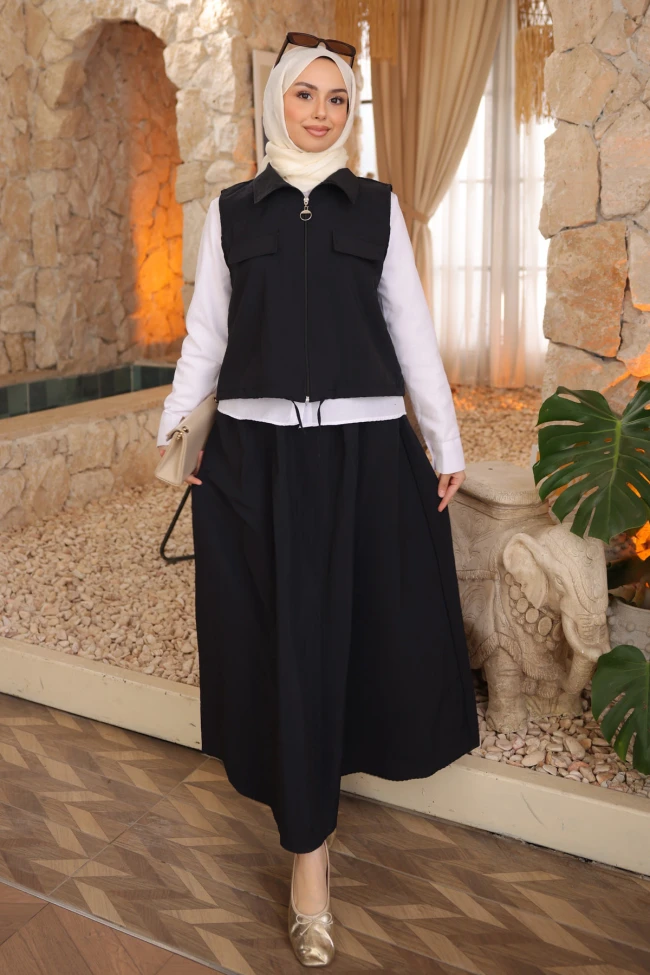 * Ürün Detay : Hem modern hem de modest giyim tarzını bir araya getiren oldukça dengeli ve şık bir kombin.Fermuarlı ve cepli yapısı takıma sportif bir hava katmış. Bel kısmındaki ayarlanabilir bağcık detayı, yeleğin formunu kişiselleştirmeye olanak tanıyor.Geniş kesimli ve dökümlü yapısı, hem konforu hem de şıklığı bir arada sunuyor. Kumaşın hafif dokulu olması, ütü derdini azaltan pratik bir tercih.Klasik beyaz gömlek, yeleğin altından hafifçe görünerek katmanlı bir görünüm oluşturmuş. Bu, stil sahibi bir derinlik katıyor. Etek ceplidir.