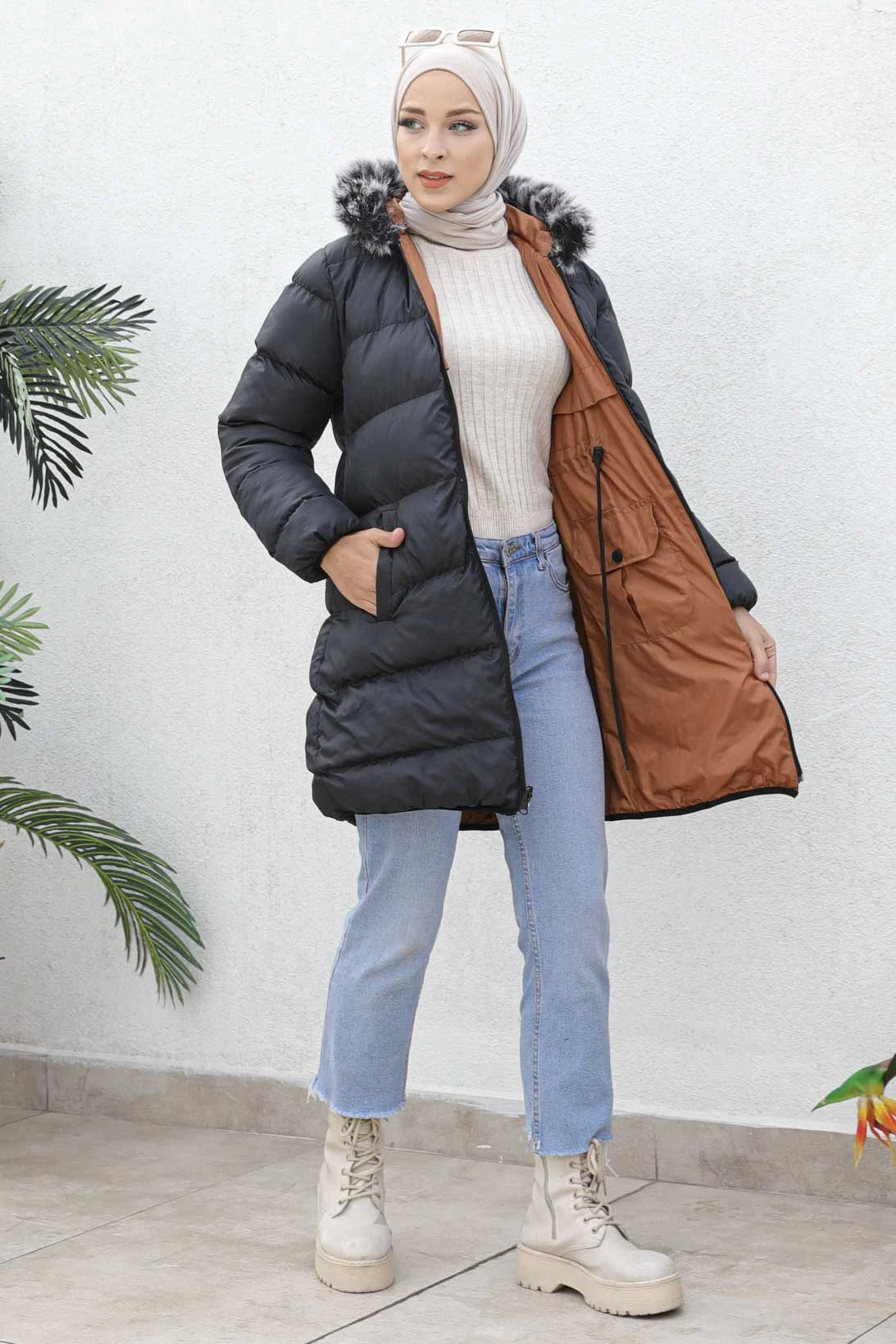 * Ürün Detay : Soğuk kış günlerinde yeni sezon montumuzu kıyafetlerinizin üzerine rahatlıkla kullanabilirsiniz.Kürk detayının mevcut olduğu parçamız şıklığıda beraberinde getiriyor.Ürünümüz kış sezonuna uygun olarak üretilmiştir.Çift taraflı kapüşonlu cepli tesettür şişme mont kapüşonu ürünle birleşiktir.Ürünün bir tarafı siyah diğer taraf renklidir.Renkli olan tarafında bel tarafı büzgülüdür.Her iki tarafta kullanılabilmektedir.