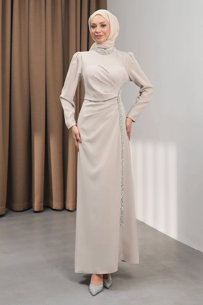 * Ürün Detay : Abiye, zarafeti ve modest çizgileri çok şık bir şekilde harmanlamış.Gövdeden yan tarafa doğru süzülen drapeler, bel bölgesini daha ince gösterirken elbiseye hareket katmış. Düz kesim etek formu ise boyu olduğundan daha uzun gösterme avantajına sahip.Yakadaki ve yan taraftaki taş işlemeler, ekstra kolye takma ihtiyacını ortadan kaldırarak odak noktasını yukarıya ve silüetin hatlarına çekmiş. Yan taraftaki şerit, elbiseye modern bir asimetri kazandırmış.