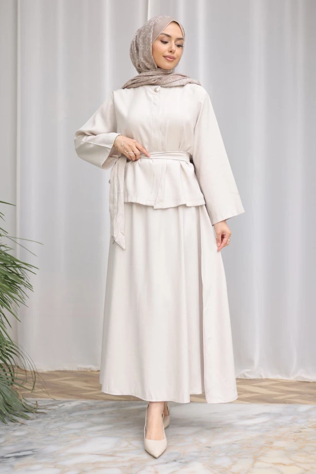 * Ürün Detay : Takım, hem sofistike duruşu hem de sağladığı konforla modest giyimin en güçlü örneklerinden biri olmuş.Gömlek formundaki üst parça, beldeki kuşak detayı sayesinde vücut formunu zarifçe ortaya çıkarıyor. Hakim yaka ve tek düğme detayı, ürüne minimalist ve asil bir hava katmış. Geniş kesim kolları ise tesettür giyimde aranan rahatlığı sağlıyor.A-kesim, dökümlü uzun etek; üst parça ile mükemmel bir bütünlük içersinde.