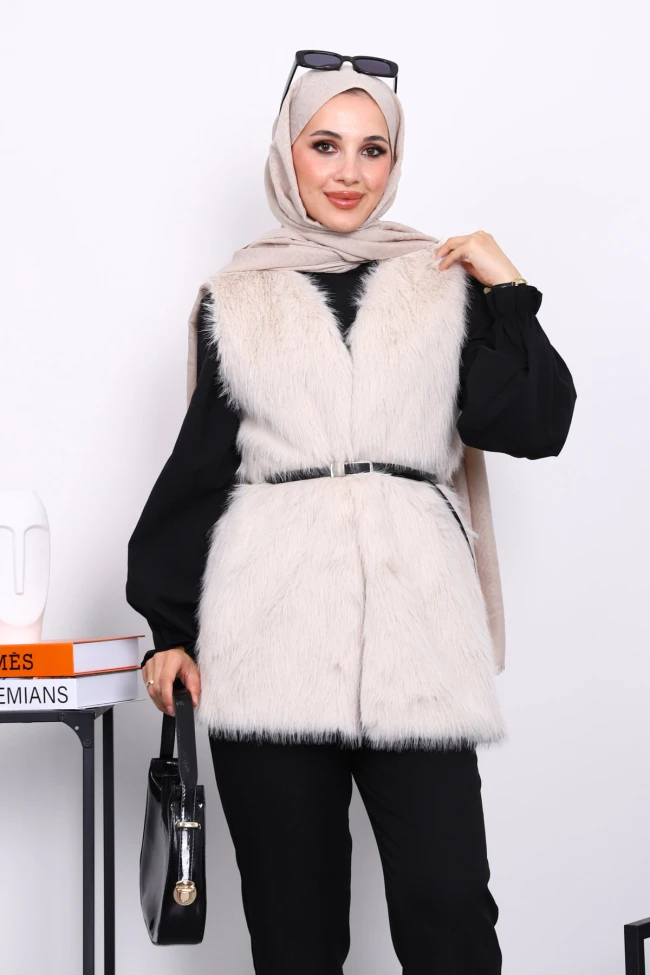Füme Kemerli Astarlı Kürk Yelek Siyah Kemerli Astarlı Kürk Yelek Bisküvi Kemerli Astarlı Kürk Yelek