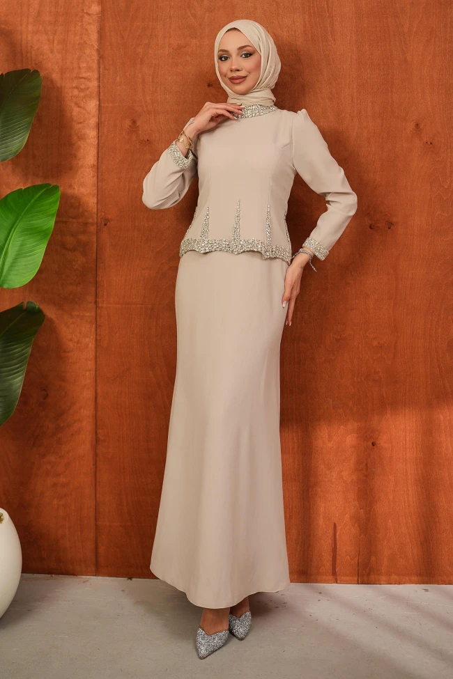 * Ürün Detay : Görseldeki abiye, modern ve klasik detayları harmanlayan, oldukça zarif bir tesettür abiye modeli.Elbise, vücut hatlarını naif bir şekilde takip eden ancak hareket özgürlüğü sunan balık kesim bir forma sahip. Bel kısmındaki taş işlemeleri, vücudu iki parçalı bir takım görünümü vererek daha uzun ve ince gösteren bir illüzyon yaratmış.Kumaş üzerine taş işlemeler kullanılmış. Özellikle dik yaka , manşetler ve beldeki asimetrik sarkıt işlemeler elbiseye zengin ve gösterişli bir hava katıyor.