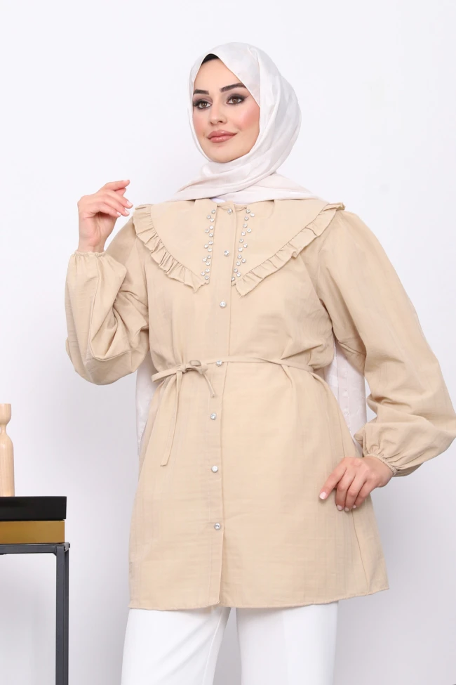 * Ürün Detay :Sezonun trend parçalarından olan bebe yaka gömlek modelimiz sizlerle. Sezona uygun poplin kumaştan üretilmiştir. Yaka taş detayı ile şık bir dokunuş sağlanmıştır. Bel bağcık detayı mevcuttur.Dilediğinizde çıkarabilirsiniz.Kolları lastiklidir.