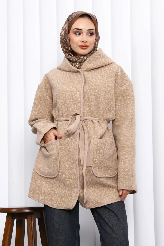 Siyah Çırçıtlı Kuşaklı Kaşe Ceket Kahverengi Çırçıtlı Kuşaklı Kaşe Ceket