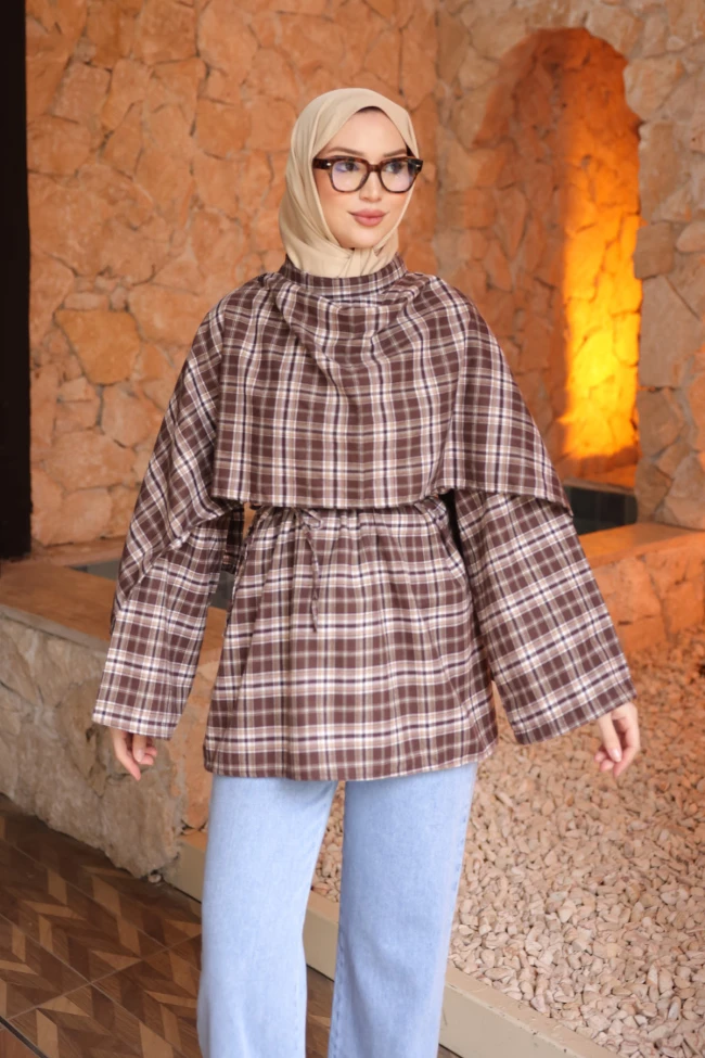 Haki Ekose Desen Bel Bağlamalı Şal Detay Tunik Kahverengi Ekose Desen Bel Bağlamalı Şal Detay Tunik
