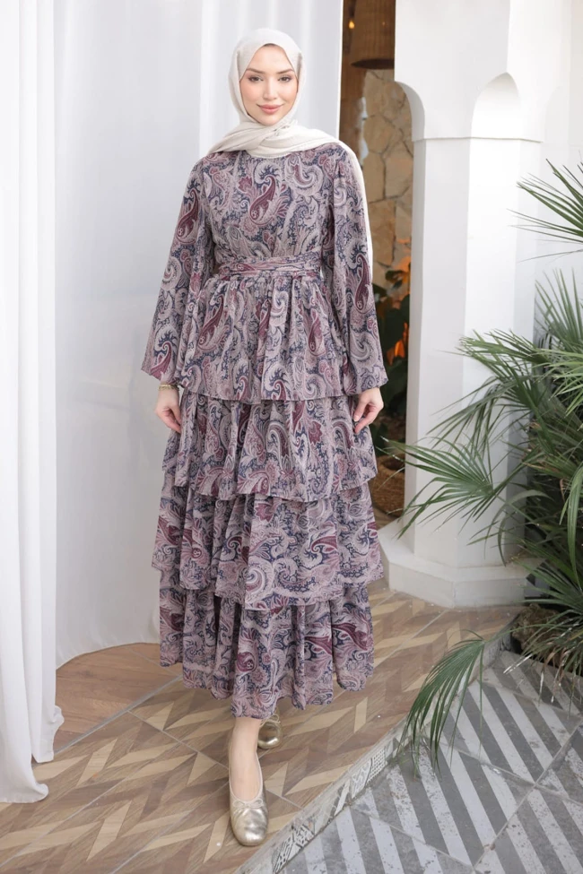 * Ürün Detay : Geleneksel şal desenlerini modern ve uçuş uçuş bir tasarımla buluşturduk! Bu elbiseyle her adımınızda zarafeti hissedeceksiniz. Beldeki kuşak detayı silüetinizi zarifçe vurgularken, katlı etek yapısı dinamik bir şıklık sunuyor.
